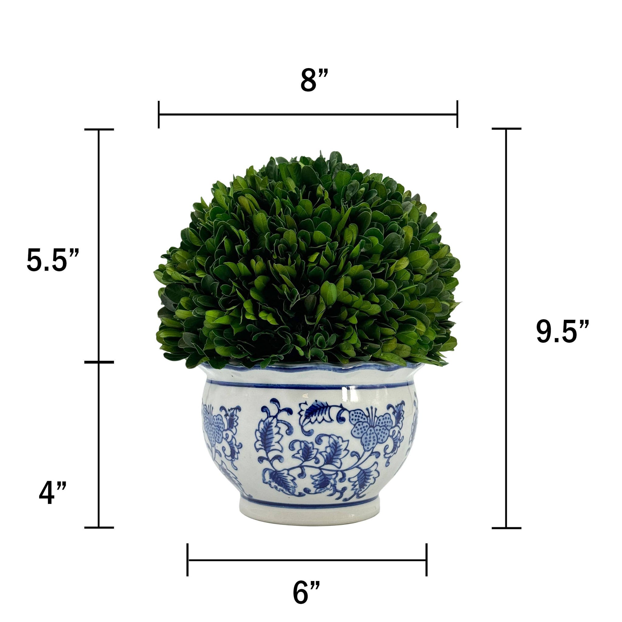 Imagine the perfect centerpiece: a perfectly manicured sphere of preserved boxwood foliage, boasting a lush, emerald hue that never fades. Nestled within a hand-painted ceramic pot adorned with intricate blue and white designs, this topiary brings a symphony of color and texture to your space. The hand-crafted ceramic pot elevates the entire piece. Each pot is uniquely adorned with delicate floral patterns, adding a touch of artisanal charm. More than just a centerpiece, this preserved boxwood topiary makes a thoughtful gift.